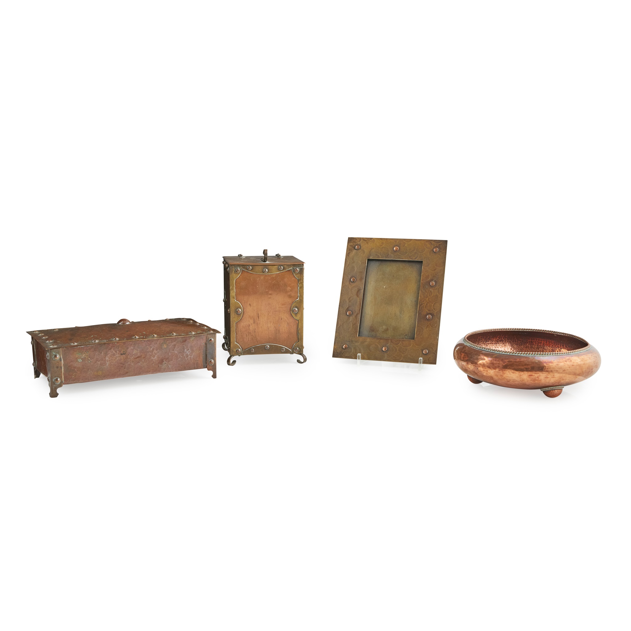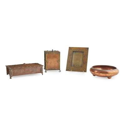 with planished finish and rope border, impressed maker's mark LYGON, 21cm diameter; a NORMAN AND ERNEST SPITTLE BRASS & COPPER PHOTO FRAME, stamped maker's marks, 21cm x 16.5cm; an ARTS & CRAFTS COPPER GLOVE BOX, with faux rivet decoration, 25cm across; and an ARTS & CRAFTS BRASS & COPPER TOBACCO BOX, with removable wooden liner, 18.5cm high