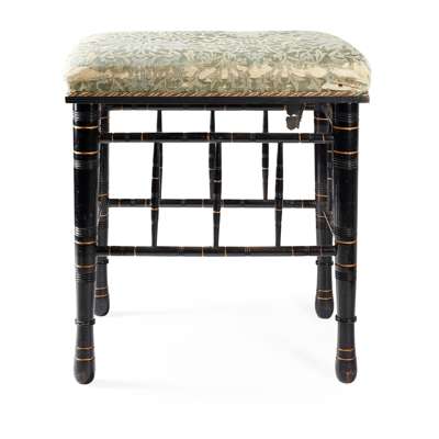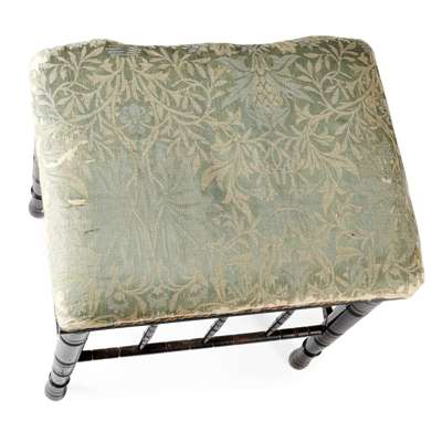 with incised gilt decoration, the woven silk upholstered seat by Morris & Co, 'Flower Garden' pattern, raised on ring-turned tapering legs, linked by spindle-filled stretchers