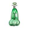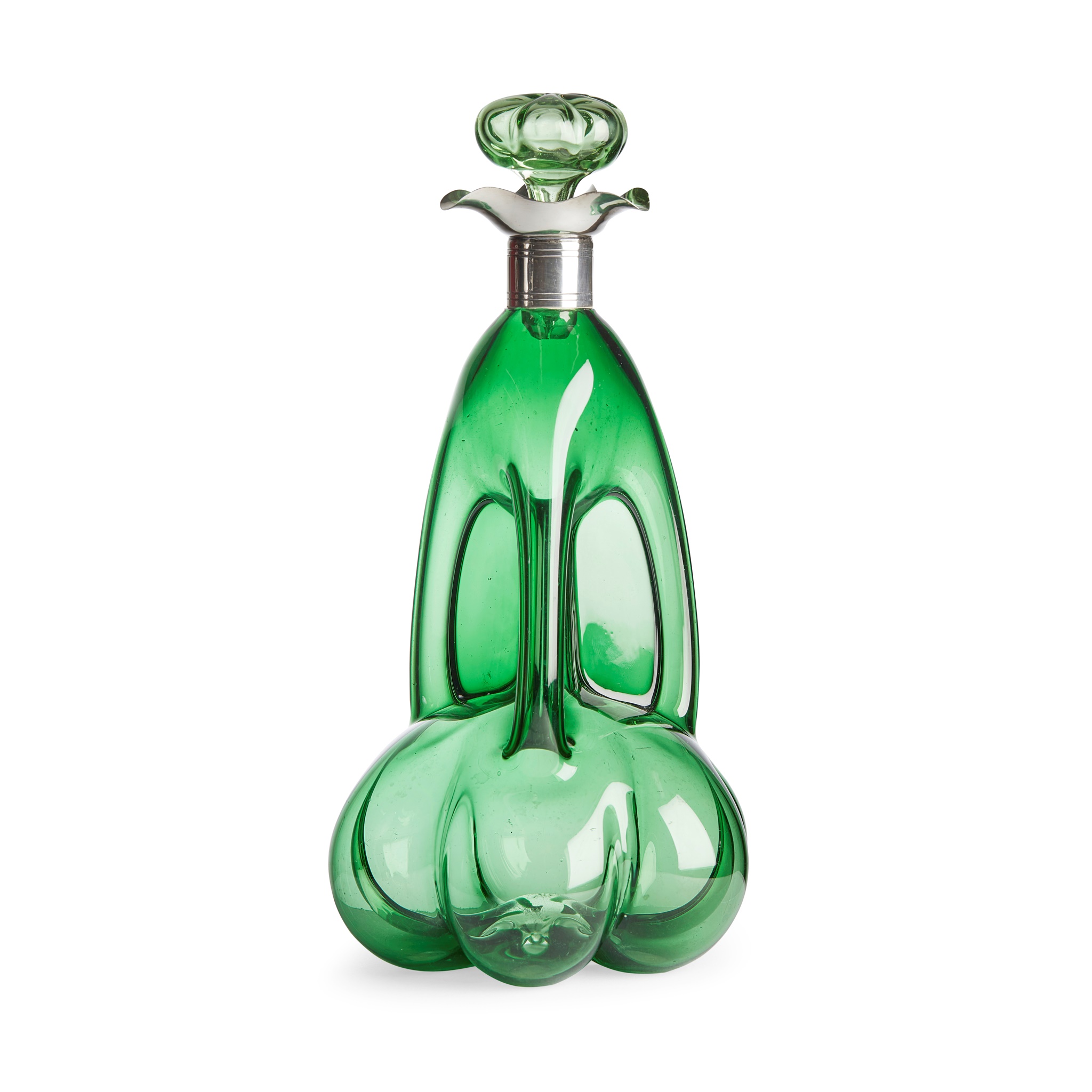 lobed base with pinched body, white metal mounted neck with green glass stopper