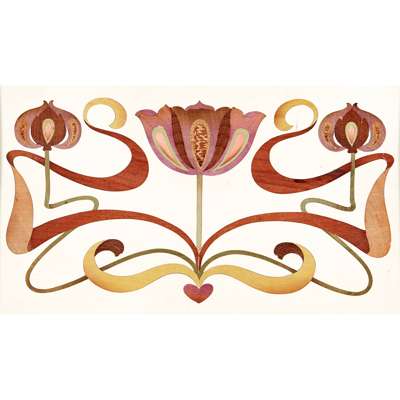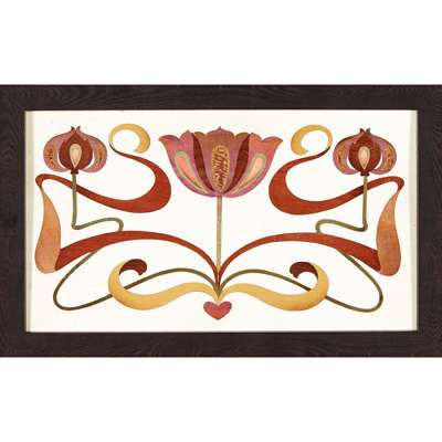 inlaid and painted specimen woods, each with a stylised foliate design, later framed