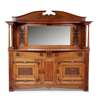 the foliate carved and arched mirror back between embossed copper panels, on twin turned uprights above a pair of frieze drawers and a central linen-fold door between pomegranate carved cupboard doors with embossed copper strap hinges and foliate stem incised uprights, on pierced apron and stem feet