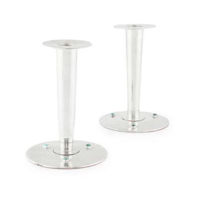 the circular bases set with three turquoise cabochons, with tapering stems and detachable sconces, stamped maker’s mark L & CO., hallmarked Birmingham, 1905-06, pattern no. 25