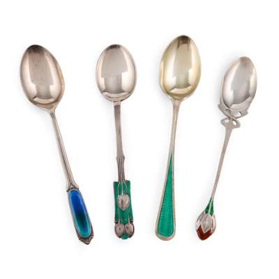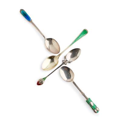 with polychrome enamelled terminals, hallmarked Birmingham 1903; another LIBERTY & CO. ART NOUVEAU SILVER & ENAMEL TEASPOON, hallmarked Birmingham 1930; and TWO FURTHER LIBERTY & CO SILVER & ENAMEL TEASPOONS, hallmarked Birmingham 1909 and 1929, all with stamped maker's marks