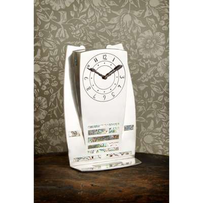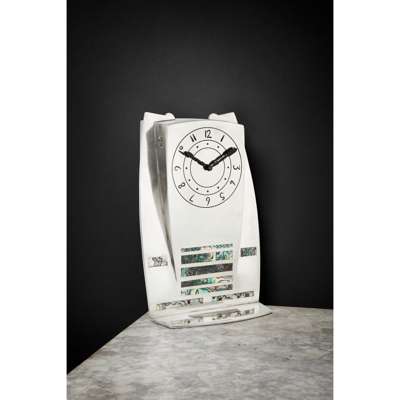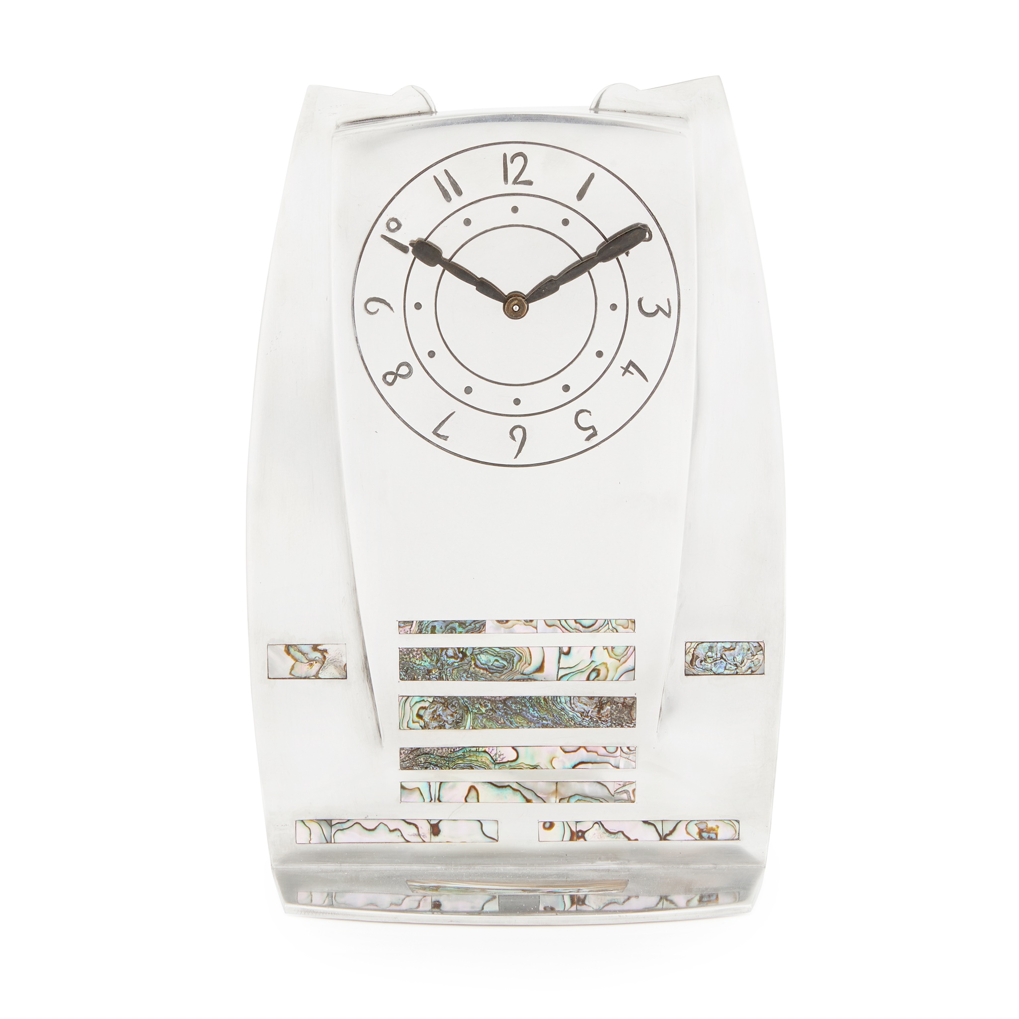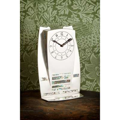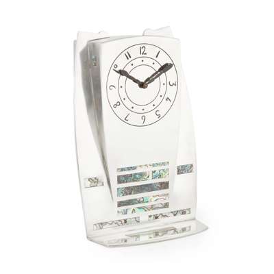 Knox’s work draws on the rich cultural heritage of his native Isle of Man. As with many of the larger clocks that are known to exist, their monumental and minimalist forms are reminiscent of the standing Celtic stones which populate the island’s countryside and which Knox spent a lifetime exploring. The decoration on this example, stripped of superfluous ornament, incorporates abalone shell inlay as a series of narrow strips; a stark and striking visual effect that signals a modernist approach to the design. This impressive clock fulfils Knox’s desire to bring together two worlds which he valued deeply: the ancient Celtic tradition and the new, modern world of design, which was undergoing the development of a new and innovative aesthetic.