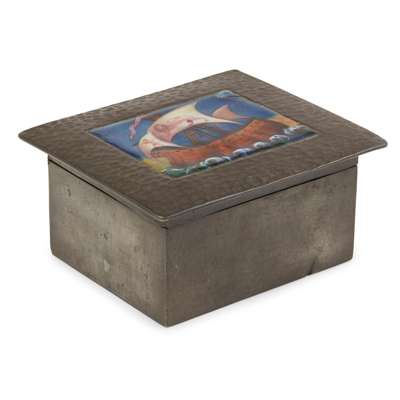 with planished finish, the lid set with an enamel plaque with a design of a galleon in full sail, stamped maker's marks 0544