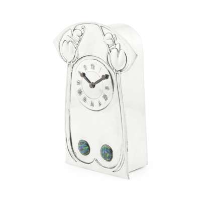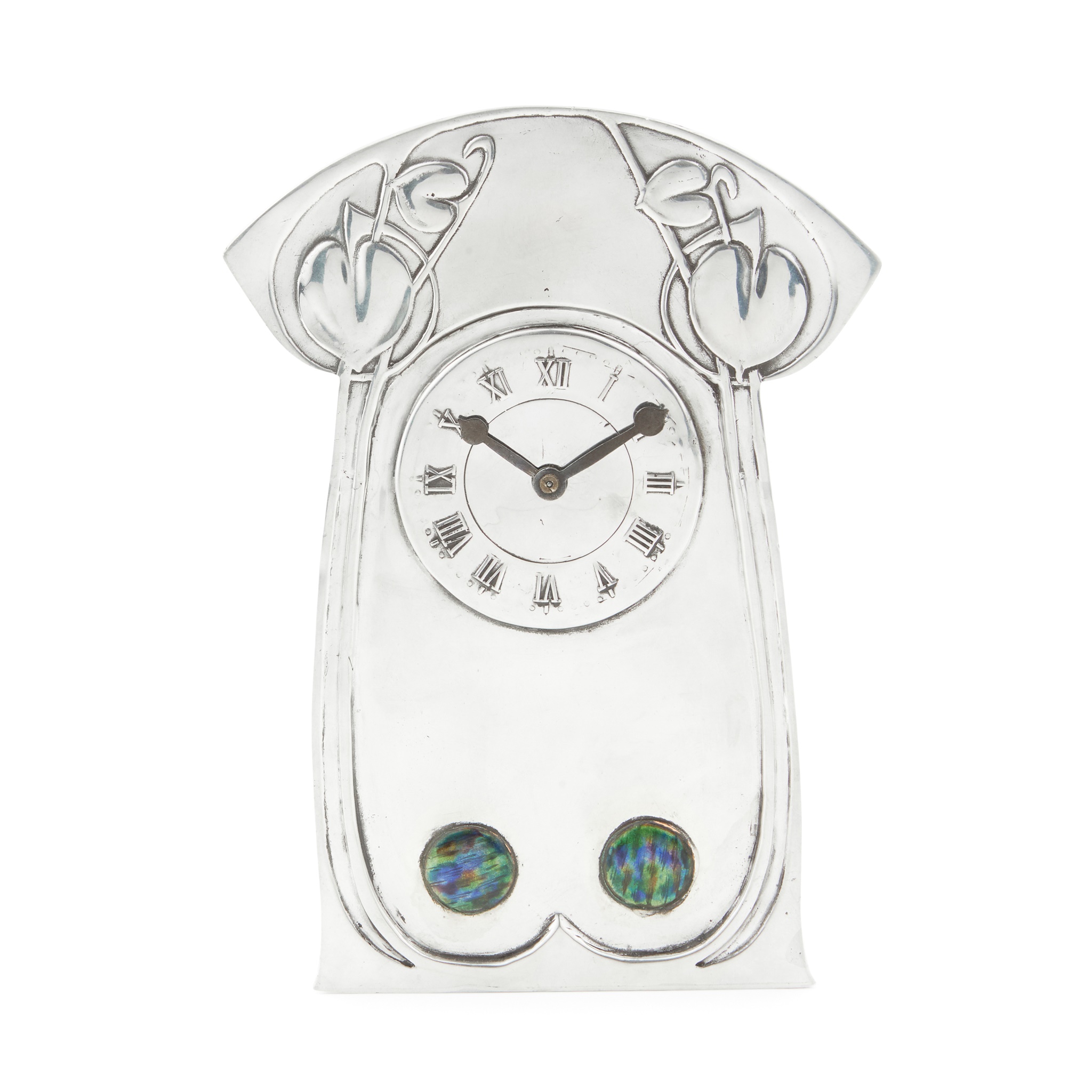 of arched rectangular form, the dial with Roman numerals above two enamel cabochons, the front cast with symmetrical stylised plant forms, with a Lenzkirch movement, stamped marks to base TUDRIC/ 0370