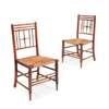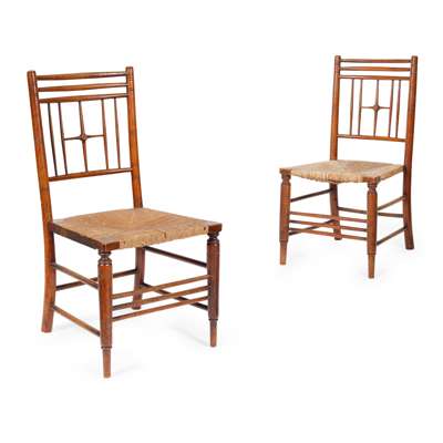 each with turned cruciform backs above rush seats, on turned tapering legs linked by stretchers