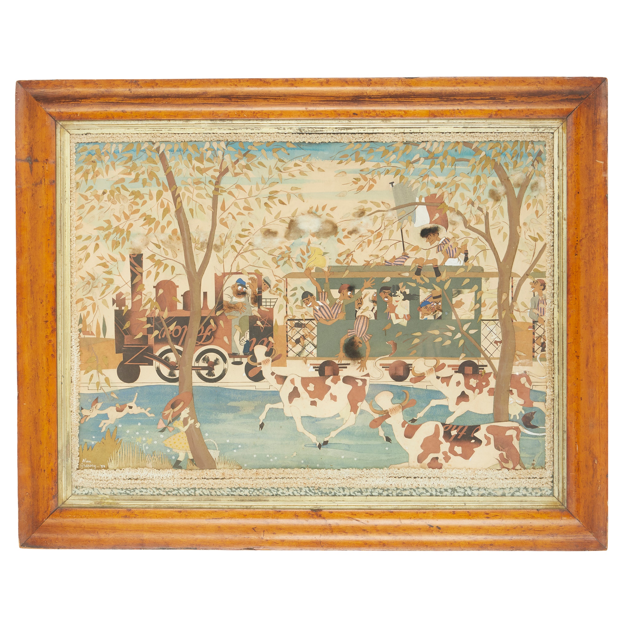 worked in cut paper, ink, watercolour, and wool, depicting a passenger steam train with various figures in football gear, a French flag, and a dog and cows in the foreground, signed Alan Gregory '38, framed