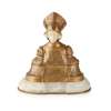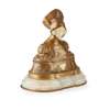 depicting a medievalist girl, the hinged lid opening to reveal a plush-lined interior, raised on an onyx plinth base, indistinctly marked to base C****ET SOREL/ 605