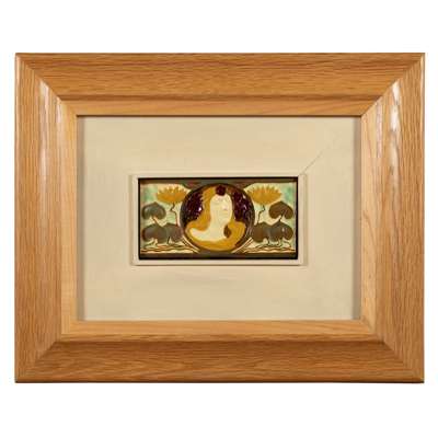 depicting a fair haired maiden, surrounded by lily pads, eosin glazed earthenware tile
