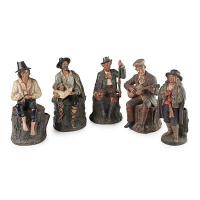 all of figural form, each modelled seated on tree stumps, comprising a MAN PLAYING A GUITAR, with impressed marks 'BB/ 3166', 29.5cm high; a MAN WITH A RIFLE, indistinct impressed marks 'BB/ 397', 28cm high; a MAN WITH A FLUTE, with impressed marks 'BB/AX/74', 30cm high; and a MAN WITH A BASKET OF TOYS, with impressed marks 'BB/ 8011', 29cm high; and a SPILL VASE, modelled as a man with a flute, with impressed marks '1145', 28cm high; together with a figural SPILL VASE, modelled as a seated boy with a fan, with impressed marks ‘JM / 6491’, 30.5cm high; TWO TOBACCO JARS, one modelled as a boy eating corn, with impressed marks ‘JM / Austria / 3406', the other modelled as a man sitting on a stump, with impressed marks ‘BB / 3003’, each 28cm high; and a FIGURE ON A CHAIR, with impressed marks ‘6455’, 36cm high