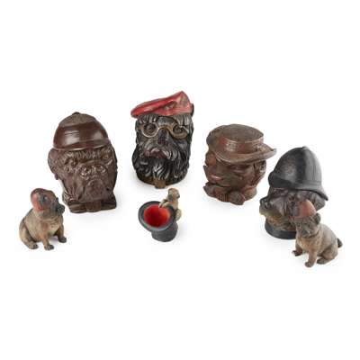 GROUP OF AUSTRIAN TERRACOTTA TOBACCO JARS AND FIGURES, CIRCA 1900