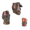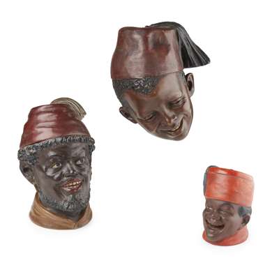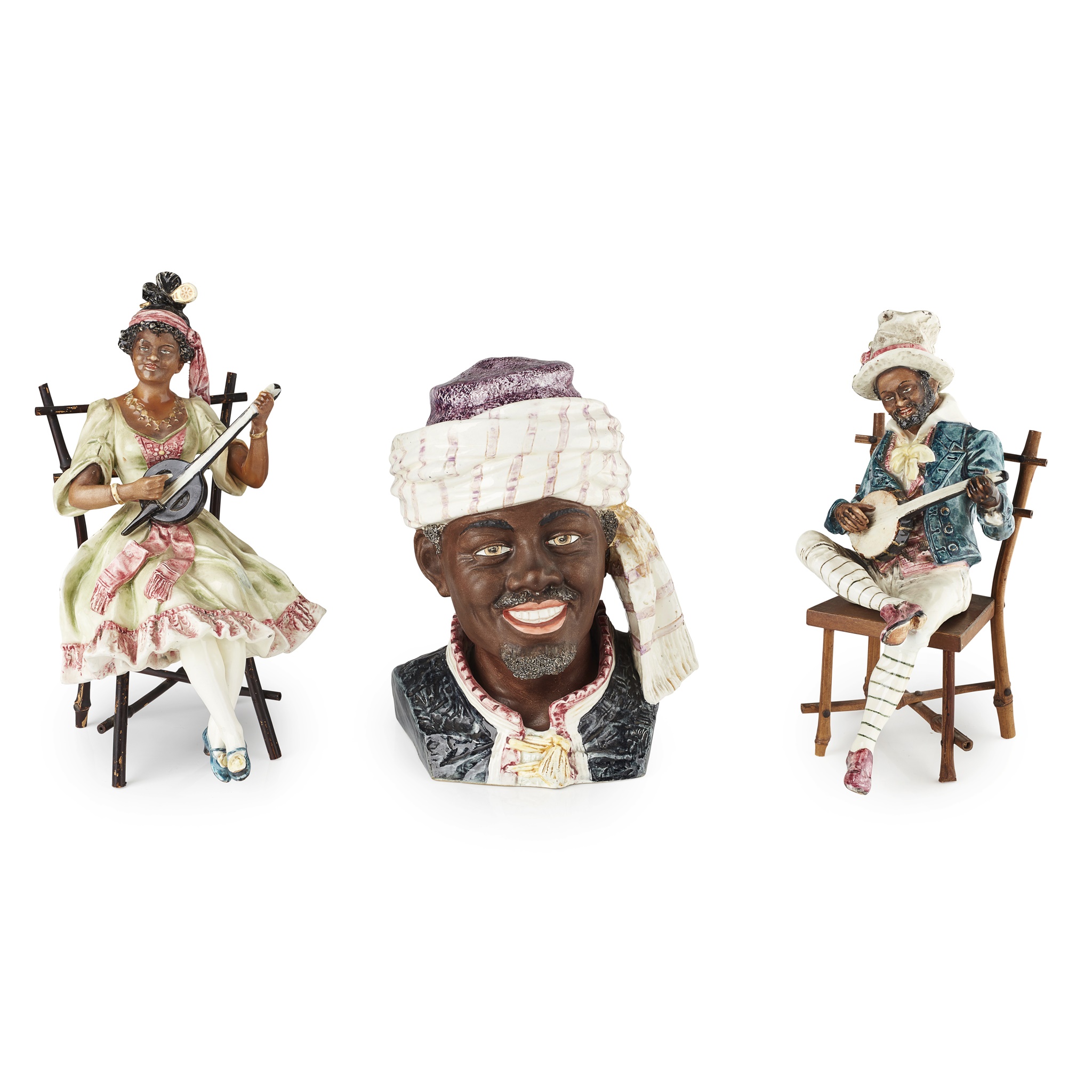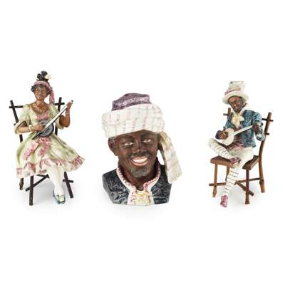 to include a PAIR OF MUSICIANS, each modelled on chairs, comprising a lady, with impressed marks ‘4907A / 39’, 32cm high (with chair); and a man, with impressed marks ‘4907 / 39’, 29cm high (with chair); together with a COVERED TOBACCO JAR, of a man, unmarked, 27cm high; a FURTHER TWO TOBACCO JARS AND A WALL MASK, to include, BOY WITH FEZ, H1607, 15.5cm high; MASK, impressed 2000/19/37, 29cm long (poss. GOLDSCHEIDER); and another MAN WITH FEZ, Jean Pecuet, 26cm high