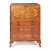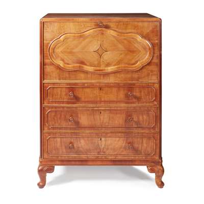 with pull-down fall, inlaid with a shaped panel, and enclosing a void interior, above three graduated panelled doors on moulded cabriole legs, bears makers label