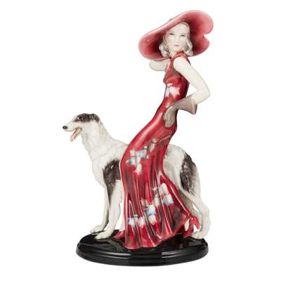 modelled as a woman in a pink dress and hat with a Borzoi, stamped and incised marks CLAIRE WEISS/ GOLDSCHEIDER/ WIEN/ MADE IN AUSTRIA/ 7367/ 142