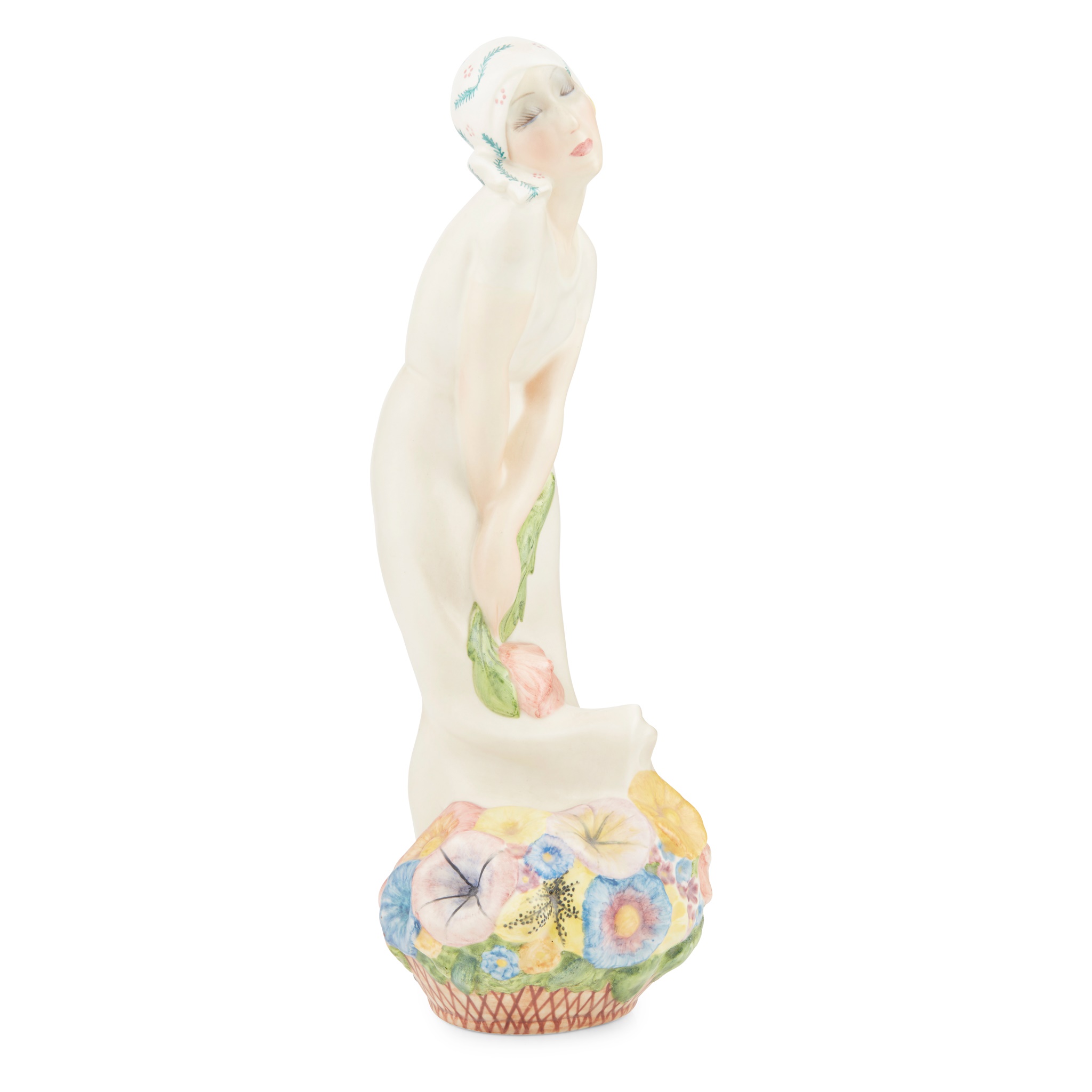 modelled as a woman standing over a basket of flowers, signed to basket, painted marks to base IGNI/ TORINO/ LV/ N. 49