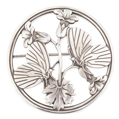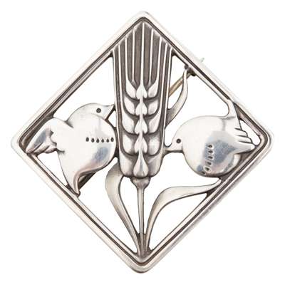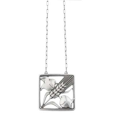 designed with opposed birds and barley head, within a square frame, stamped maker's marks GJ/ 925 (twice)/ STERLING DENMARK/ 250, 3.6cm across; together with a STERLING SILVER PENDANT NECKLACE, MARKS FOR 1933-1944, designed with opposed birds and barley head, within a square frame, with fine link chain, stamped maker's marks GJ/ 925/ STERLING DENMARK/ 93, pendant 3.5cm across; length of chain 28.5cm approx; and a STERLING SILVER BROOCH, CIRCA 1942, of circular outline, depicting two butterflies amongst flowers, stamped marks GJ/952 S/DENMARK/283, 5.5cm diameter