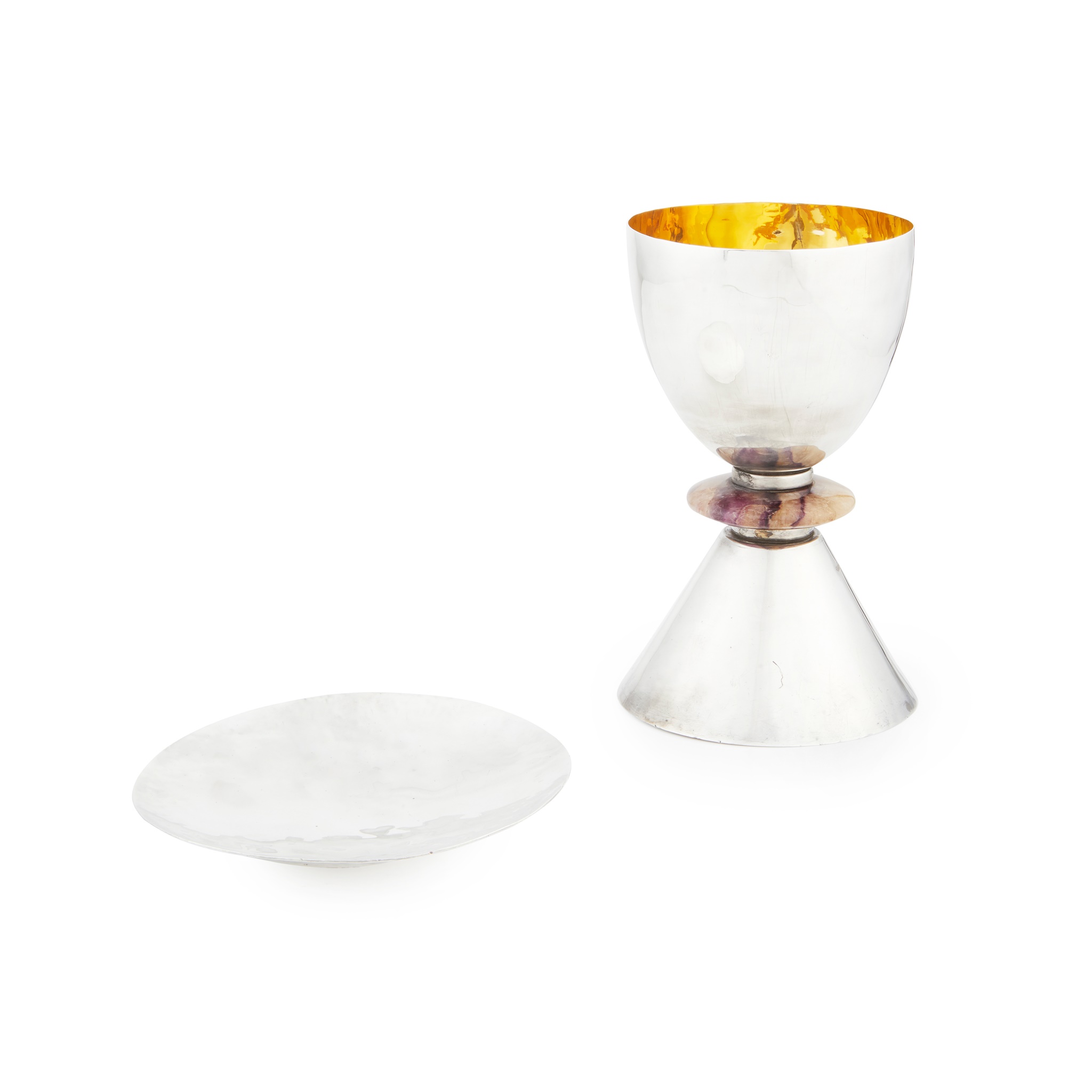 the bowl with gilded interior, the tapering base with feldspar knop, stamped maker's marks DMR, hallmarked London 1965