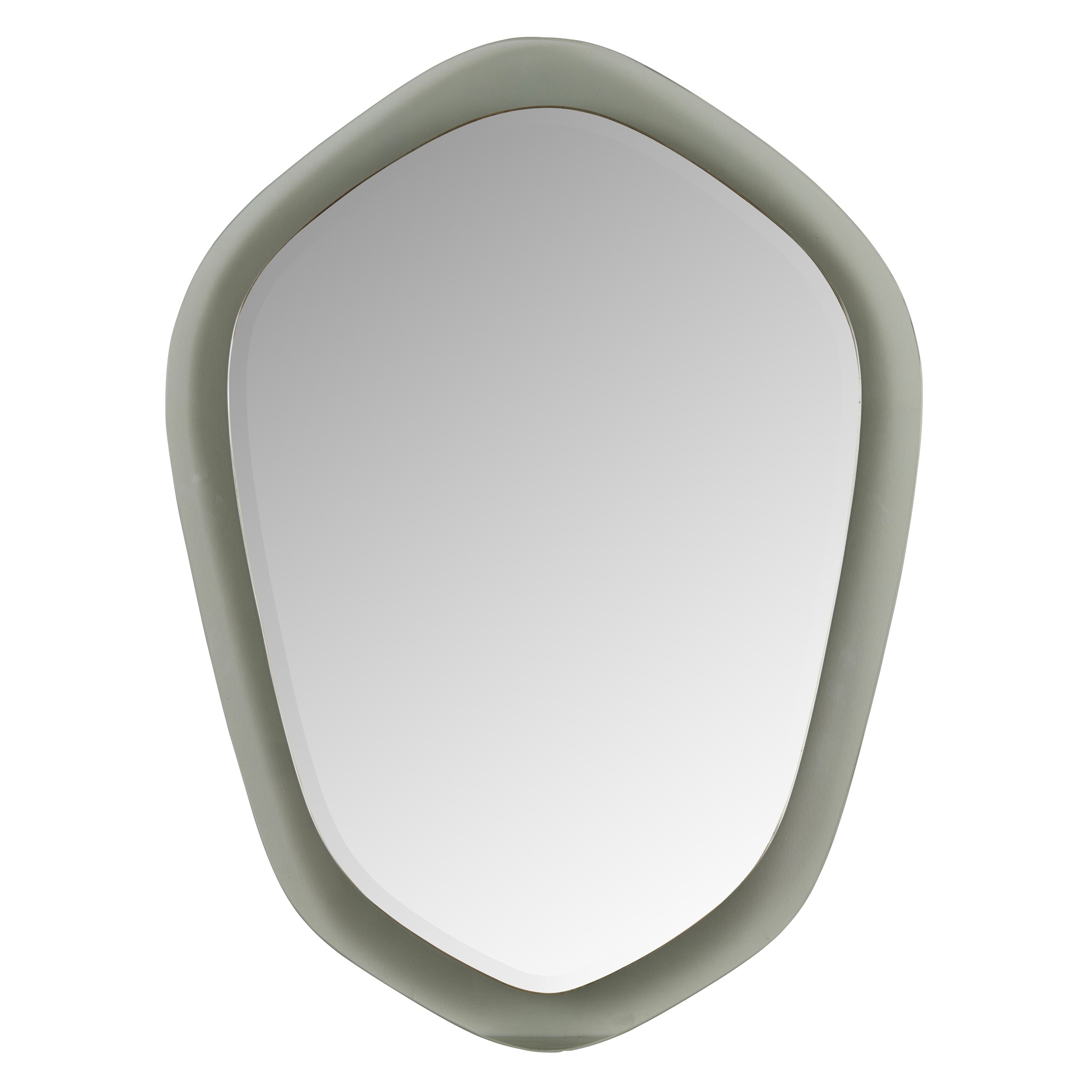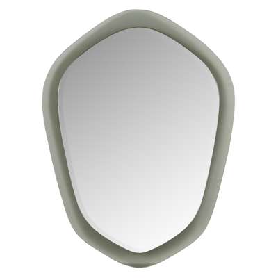 the elliptical organic form, the mirrored plate enclosed by a grey frame