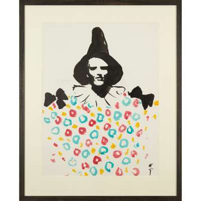 Pen and ink, signed with monogram, framed, 39cm x 56cm; and another by the same hand FIGURE OF A CLOWN, pen, ink and bodycolour, framed, 64cm x 48cm