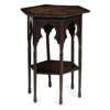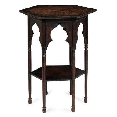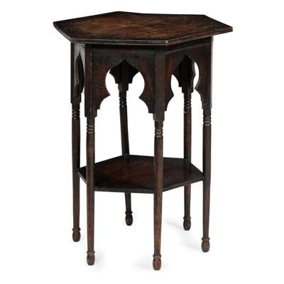 the circular top with fret-filled panels, on splayed legs, linked by a lower tier, 29cm diameter, 91cm high; together with an ARTS & CRAFTS OCCASIONAL TABLE, ATTRIBUTED TO LIBERTY & CO., LONDON, the hexagonal top above ring-turned legs, linked by a lower tier, 47.5cm wide, 69.5cm high