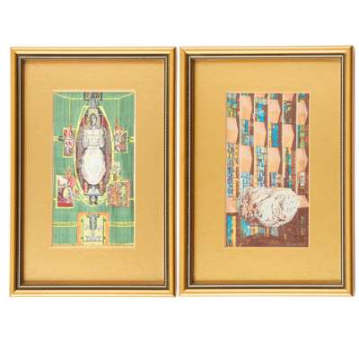 with printed label verso inscribed SUTHERLAND TAPESTRY, framed and glazed, 13cm x 7cm; together with a FURTHER JACQUARD-WOVEN SILK PANEL BY J &J CASH LTD, with printed label verso inscribed BETHLEHEM FONT AND BAPTISTERY WINDOW, framed and glazed, 12.5cm x 7cm