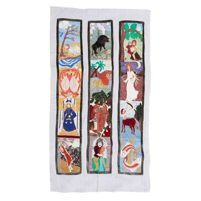 coloured fabrics and threads, the design depicting the signs of the zodiac reserved on a later linen backing with hanging rings