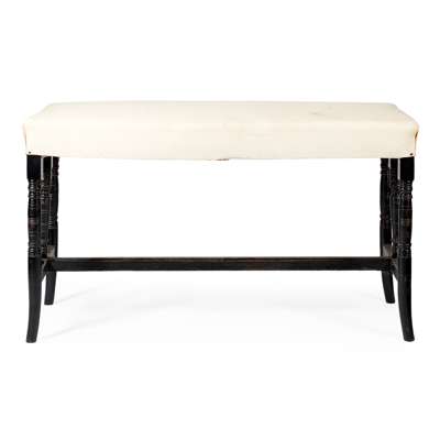 the close-nailed upholstered seat above ring-turned legs, linked by a stretcher