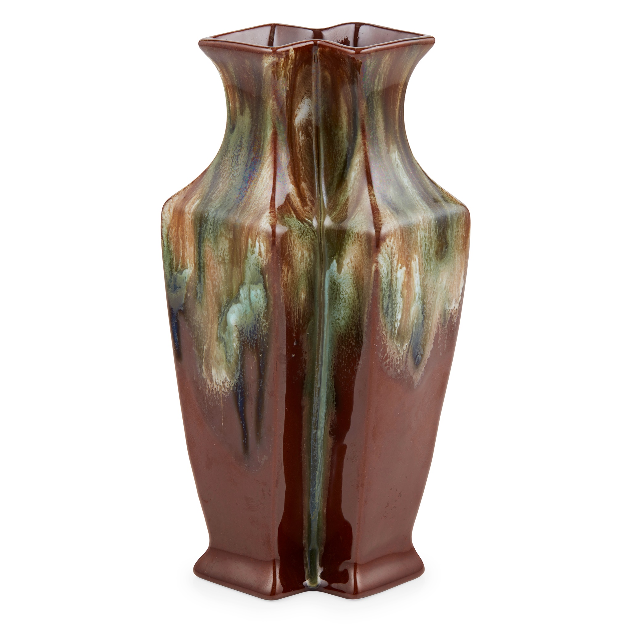 of double diamond section, covered in a streaky green glaze on a brown ground, indistinct impressed maker's marks LINTHORPE/ HT (Henry Tooth) and impressed facsimile signature Chr. Dresser