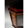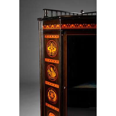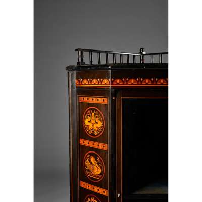 Note: This fine cabinet, although of conventional form, has particular design characteristics which set it apart; its distinctive gallery and the fine marquetry panels inlaid to the sides. The design of two of the inlays appear to be adapted from colour plates published in Christopher Dresser’s Studies in Design of 1876 - the hares from plate VII; and the duck from bird designs in plates XLVI and VI. There are also strong similarities to an illustration in his Principles of Decorative Design of 1873 (the fish from figure 20); and bird and animal designs for Minton & Co. circa 1871. These designs were, like other output from the Christopher Dresser’s studio, often drawn up and, on occasion designed under Dresser’s supervision by an assistant. In the case of the first two examples this assistant is thought to be the Scottish-born designer John Moyr Smith.