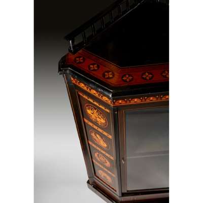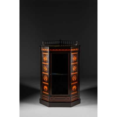 AESTHETIC MOVEMENT EBONISED AND INLAID CORNER CABINET, CIRCA 1875