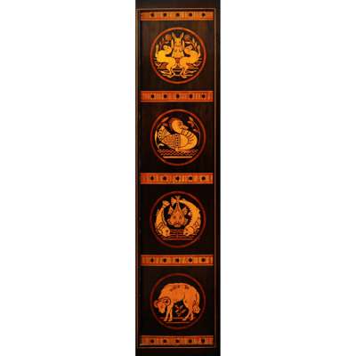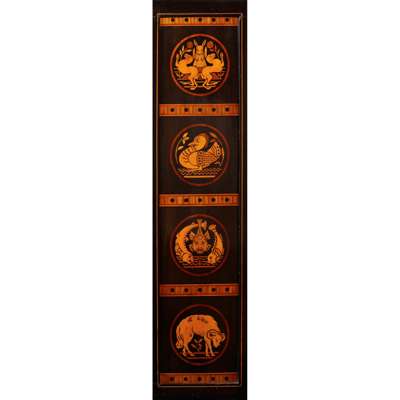 The panels in the current lot, representing Game, Fowl, Fish and Mutton may also have been designed for a similar dining room scheme. The profuse, albeit restrained, marquetry inlay of this cabinet is somewhat at odds with Dresser’s more characteristically austere and pared-down aesthetic. He was, however, known to have been expedient and his ‘theoretical utterances’ did not always get in the way of the success of a busy studio where it was impossible to be entirely pure in intention. Many of Moyr Smith’s published designs of the 1870s were later ascribed to Dresser suggesting their origins in Dresser’s studio. Either way, until further information emerges, the attribution of many of these intriguing pieces remains unclear.