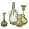 comprising a THREE-HANDLED VASE, with applied spiralling neck and bulbous body, 21.5cm high; a TALL OVOID VASE, with tapering and knopped neck, 19cm high; a BOTTLE VASE, 12.5cm high; and a DOUBLE GOURD VASE, by George Walton, 11cm high, each with aventurine and milky trailed inclusions