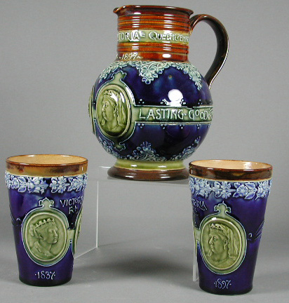 of ovoid form with cylindrical neck and applied foot commemorating Queen Victoria's Diamond Jubilee, moulded with cameos of the young and old Queen and bearing the legend 'She brought her people lasting food', painted in shades of brown, blue and green, impressed and incised marks, 18.5cm high, also a pair of Doulton Lambeth stoneware beakers, of tapering cylindrical form, commemorating Queen Victorias' Diamond Jubilee ensuite, impressed and incised marks, 12.5cm high (3)