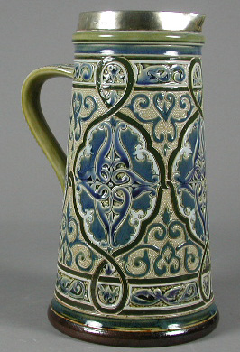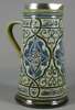 with silver mounted rim, the body incised and moulded with elaborate scrollwork and panels of spirit orchid frames, painted in blue, green and buff, textured ground, impressed and incised marks 'ES 686'