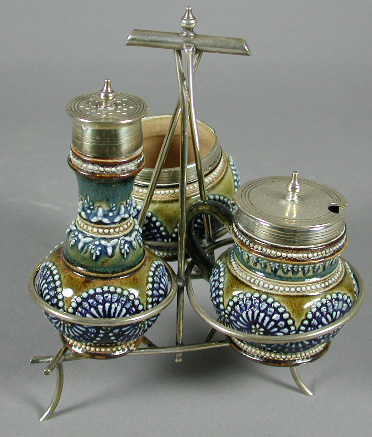 comprising an open salt, covered mustard and pepper on a silver fitted stand, all painted in white, brown and blue with applied scrolling and flower design, incised monograph for Emily M R Welsh and Alice Longhurst and dated 1882, silver hallmaked Birmingham, 1883 (4)