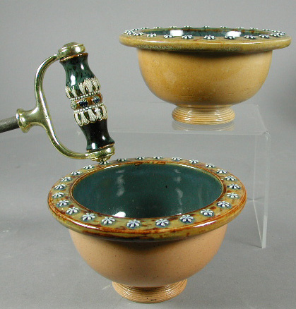 each cup glazed in blues and browns, with applied rosette rims, impressed and incised marks, 14 cm diameter, the handles with applied foliate decoration (4)