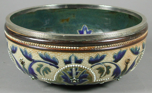 painted in brown, white, blue and lovat with silver rim, applied and incised beadwork, decorated externally and internally, incised marks for Elizabeth M Small , Mary Aitken (?) and Lilian Curtis, and dated 1879, rim hallmarked Birmingham 1879