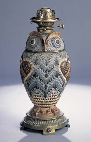 A Doulton Lambeth 'Slaters Patent' owl oil lamp