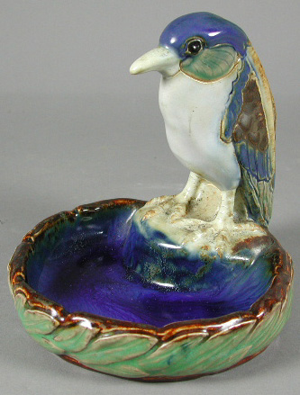 the circular dish surmounted by the figure of a night heron, impressed and incised marks for Maud Bowden