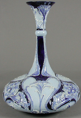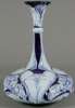 with tall neck and flaring rim, painted in shades of blue, printed marks, incised initials,