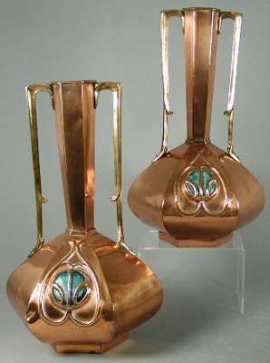 each of hexagonal section, with bulbous ovoid bodies and tall tapering necks inset with opposing Ruskin turquoise roundels within a repousse foliate motif (2)