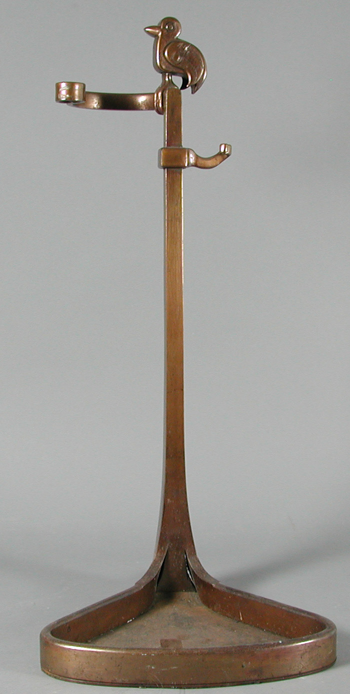 the tapering square section column with perched bird surmount and scroll support for irons, galleried shaped tray below