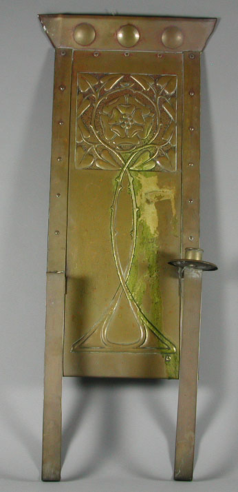 of rectangular outline, repousse decorated with a stylised and thorny rose bush and with applied candle sconces with rivited decoration