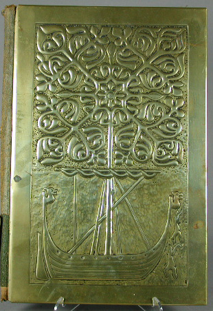 repousse decorated with an elaborate flowering tree, eminating from a long boat with running dogs, forming the front of a stationery folder, 35cm x 23cm, also a brass bird figure with hinged back (2)