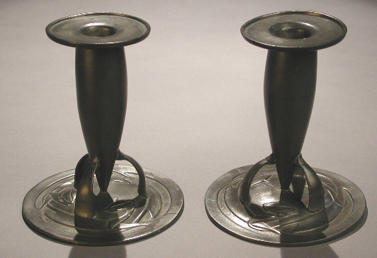each with broad drip trays and tapered supports with three flared brackets on a broad circular base cast with entwined tendrils, stamped mark 0221 (2)