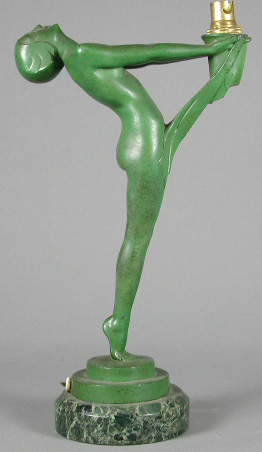cast a naked female holding aloft a light fitting and standing on a stepped circular base with green marble plinth, signed in bronze