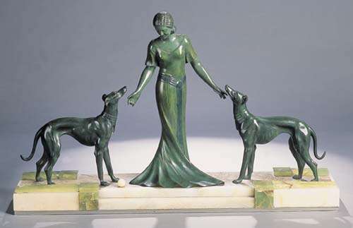 of a lady in flowing dress flanked by two hounds, raised on green and white stepped onyx base, signed to base