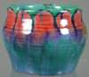 of tapering cylindrical form with everted rim, glazed in streaked red, blue and green, incised marks, dated 1908, 16.5cm high, also a small Allander ovoid bowl, similarly decorated, incised and printed marks, dated 1905 (2)