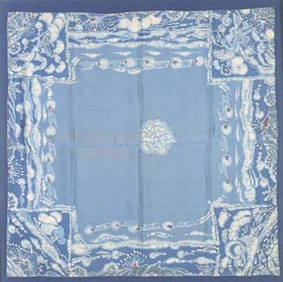for Liberty & Co., London, decorated in white and pale blue with a border of stylised floral and foliate motifs and with central rosette on a cornflower blue ground,